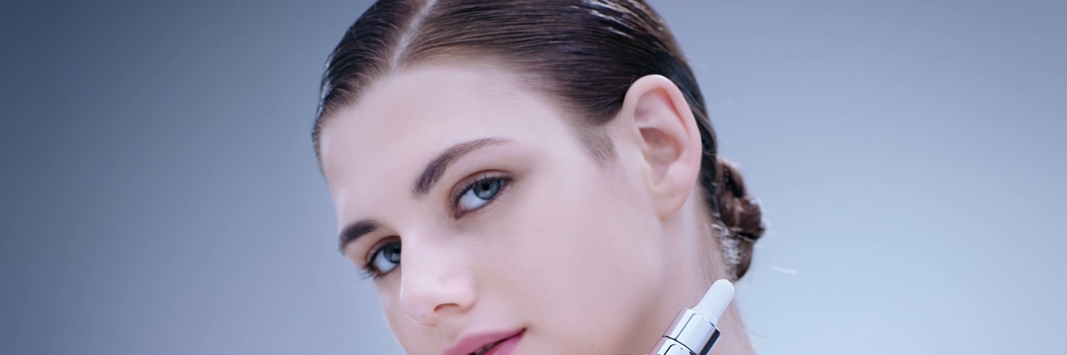 光影是影视画面的雕刻刀,决定着影片的基调。低饱和度,冷色调的画面更具备科技感,高级感。而碳云智能的护肤产品包装简约,通透的玻璃瓶外包裹着银色的外壳。因此我们结合碳云智能的产品色系,选择了清冽通透的冷光蓝调,提高画面的亮度,呈现出澄澈,透亮的画面效果。